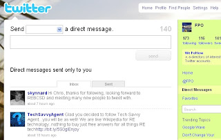 Following all your direct messages can get a bit tricky using the simple but effective built in Twitter tools. To manage my twitter Ive been using Tweet Deck or @tweetdeck. Its a quick Download at http://www.tweetdeck.com/ that allows you to view messages in movable columns. I follow my DM's in one collum, my mentions (where someone includes @fpo in a message) in another and then can track trending topics or conversations in several other columns. Tweet Deck allows for easy to follow DM tools. Simply mouse over the avitar (photo) of whom you wish to DM, look for the envelope icon (it is the icon for a DM in Tweet Deck) to pop up and click it.